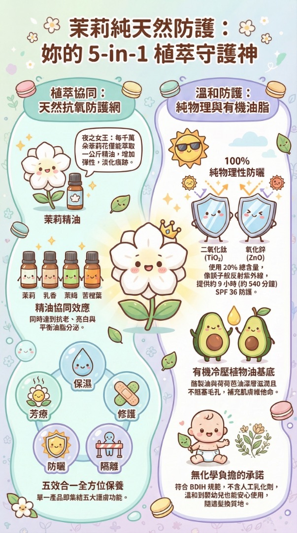 「茉莉日間防護霜 SPF36」結合物理性防曬與多重抗氧化植萃,質地輕盈不黏膩,能深層保濕修護。其溫和親膚的特性,讓敏感膚質與嬰幼兒也能安心適用。